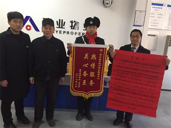 2月22日晚,三門峽·建業(yè)綠色家園巡邏禮兵楊官才在園區(qū)巡查時,發(fā)現(xiàn)業(yè)主車輛窗戶未關(guān),內(nèi)有現(xiàn)金5000余元、中華煙兩條及各種證件,他及時通知禮兵中隊長謝丹,監(jiān)控員白慧娜利用攝像頭對該車輛著重監(jiān)控,通過車輛信息及時電話聯(lián)系到業(yè)主,十分鐘后業(yè)主來到了禮兵值班室,禮兵核對業(yè)主信息后將遺失的物品交還到業(yè)主手中。業(yè)主為表示感謝,特送來錦旗一面。