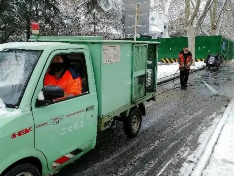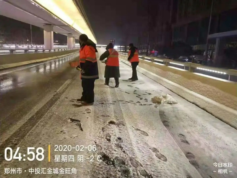 建業(yè)物業(yè)鄭州二七環(huán)衛(wèi)工人首先在上下橋口、主干道、天橋等地集中撒鹽,緊接著再集中力量,用鐵锨、掃把、推雪板、推雪鏟清理主干道、使用垃圾清運(yùn)車集中運(yùn)輸積雪,道路上的積雪清除干凈后,他們并沒有停下來,立即著手使用機(jī)械化清掃車進(jìn)行路面洗掃、沖洗……近8個(gè)小時(shí)的不間斷作業(yè),終于將一條條主干道清理干凈。