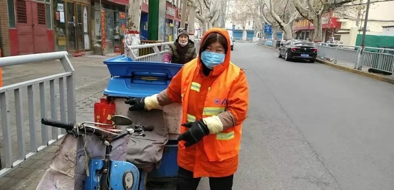 路上已不見行人的身影,但是穿著橙色保潔工裝的環(huán)衛(wèi)工人卻依然在崗,他們作為防疫戰(zhàn)線一份子,兢兢業(yè)業(yè)站好每一班崗,清掃干凈每一條負(fù)責(zé)的街道。