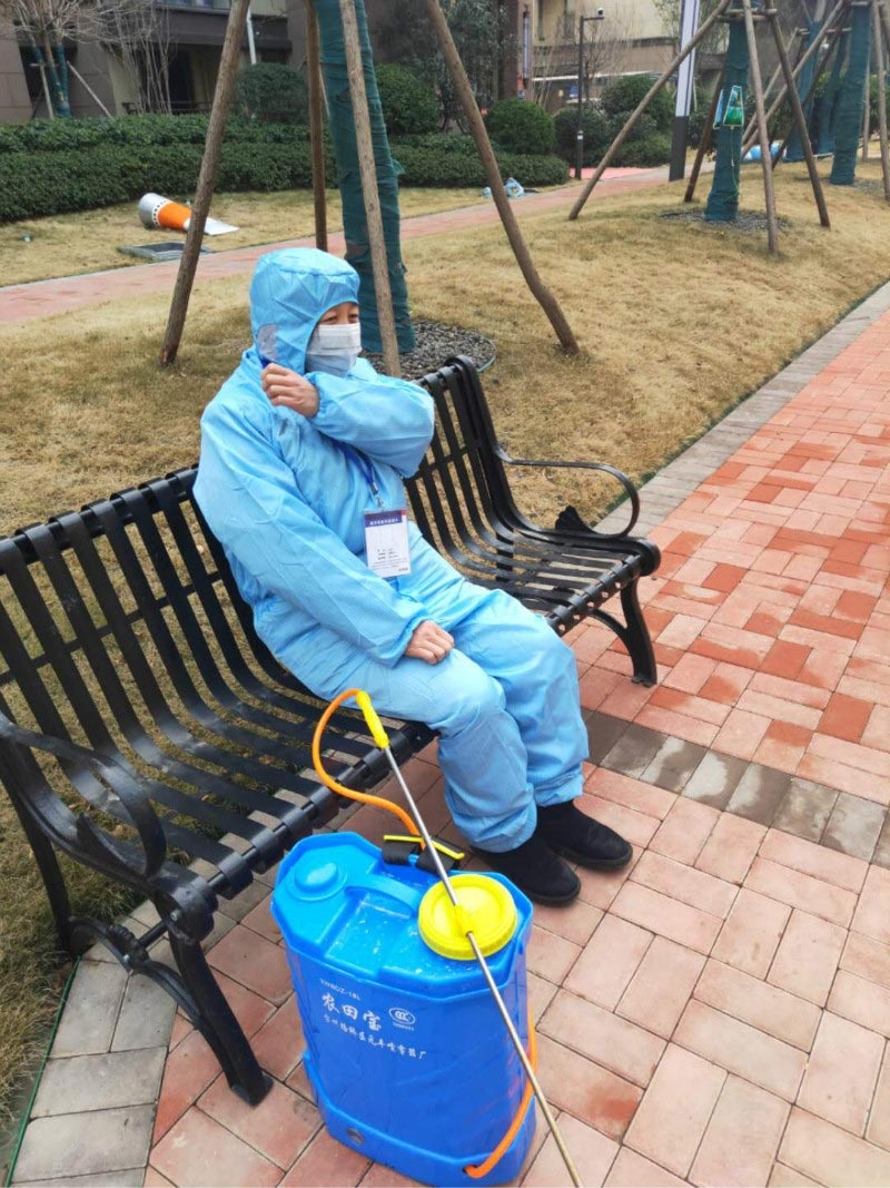 2月8號,已經(jīng)連續(xù)工作11天的李亞偉背著藥桶對園區(qū)進行當(dāng)日的第二遍消殺時,腰痛病發(fā)作,一時疼得直不起來。她靠在園區(qū)休閑椅上稍作休息后便又再次投入工作。