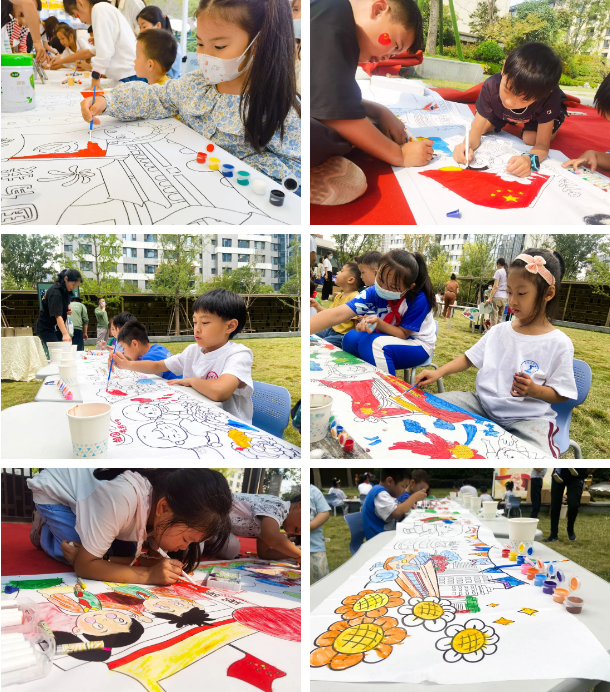 一幅百米畫卷由小業(yè)主們合力完成,作為獻(xiàn)給祖國的最好禮物。他們涂抹出多彩的圖案,也描繪著祖國美好的未來,小業(yè)主們用剪紙手工制作花環(huán),表達(dá)著自己對祖國的熱愛。擅長書法的業(yè)主們,用遒勁有力的筆觸,書寫著對祖國母親的深深情懷。